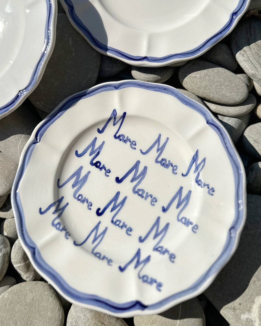 Il set di piatti da 21 cm  “Mare Mare” unisce la tradizione della ceramica italiana alla bellezza del Mediterraneo. Ogni piatto, dipinto a mano nei toni intensi del blu, evoca l’infinito del mare e riporta frasi iconiche come: