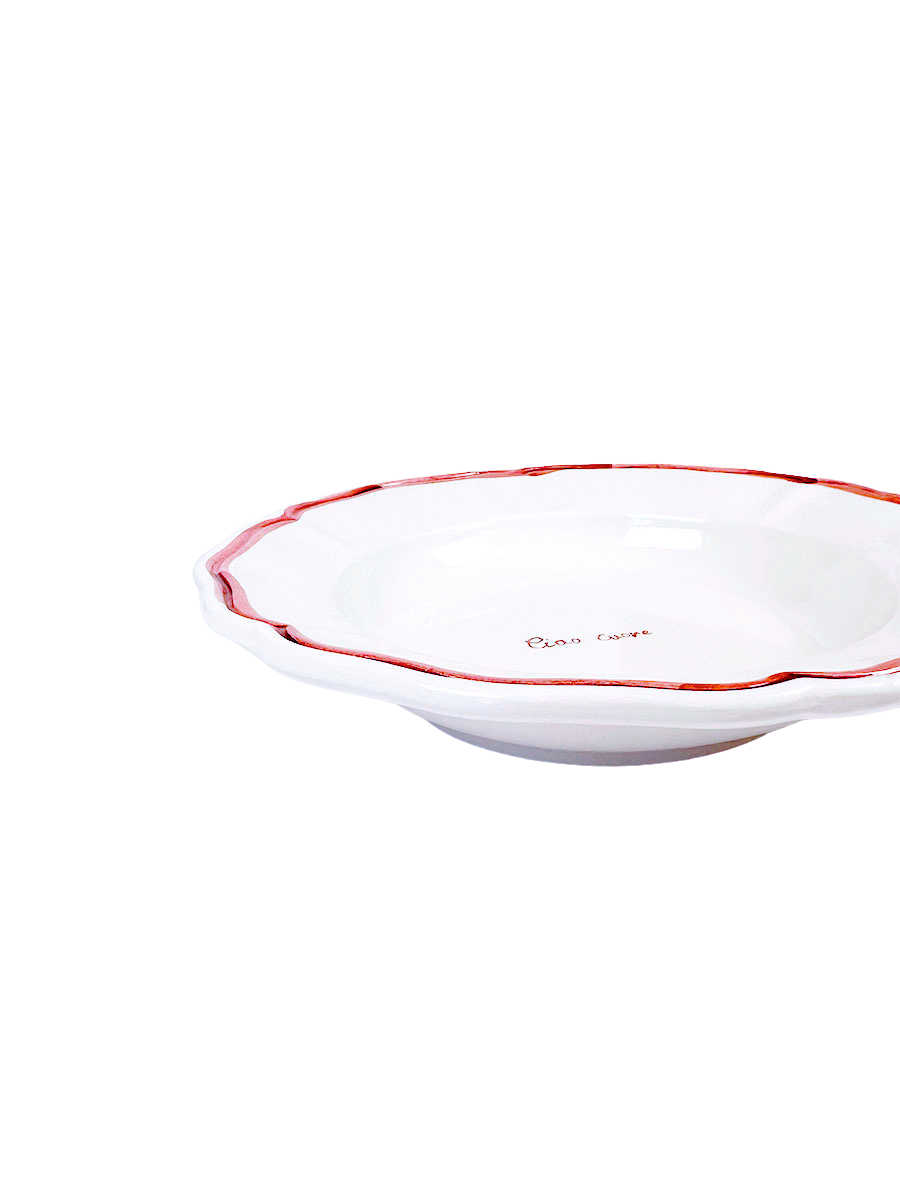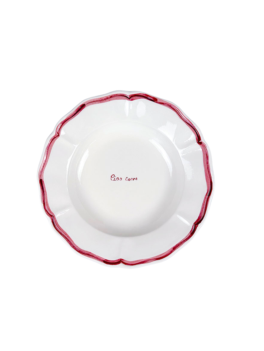 Vi presentiamo il piatto fondo “Ciao Cuore” della Collezione Fil Rouge – una serie di piatti giocosa e chic. Dipinto a mano con cura dalle nostre Musae nel Cilento, questo piatto da 25 cm è un vero e proprio pezzo unico, con un carattere tutto suo, sia nell’aspetto che nella texture.