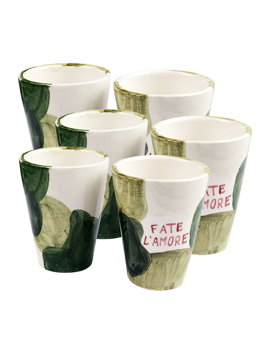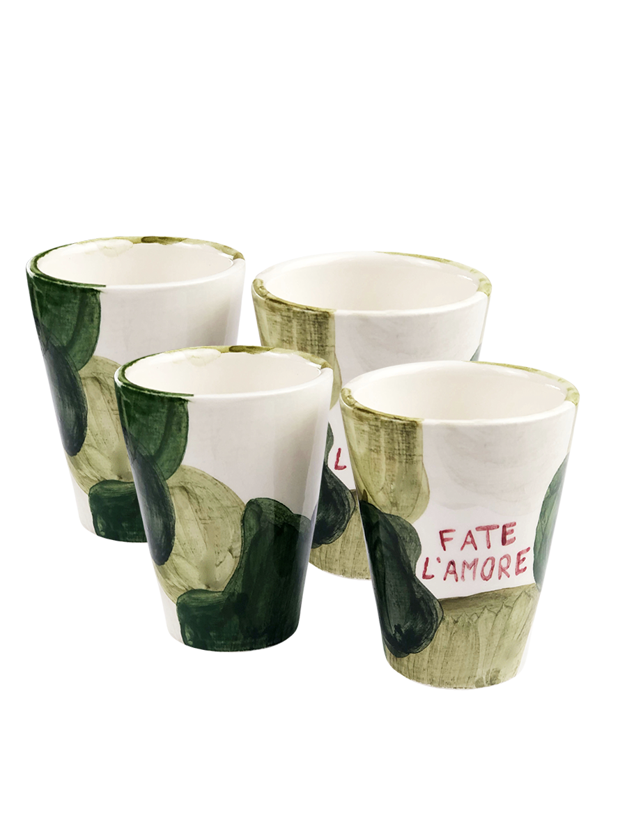 Questi bicchierini dipinti a mano (6,5 x 5 cm) sfoggiano un look mimetico e una scritta che non lascia spazio a interpretazioni: “Fate l’amore”.
